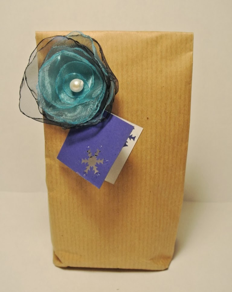 | Hnědý balící papír ozdobený papírovými květinami a papírovou stuhou |