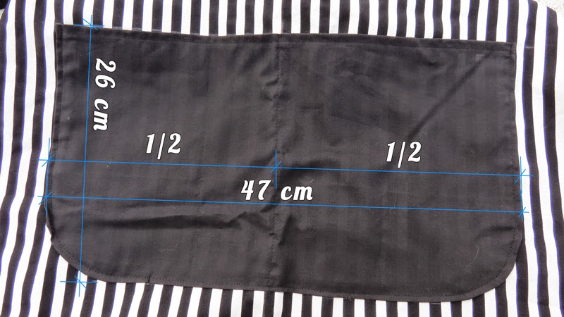 Látky SOFIA na tělo zástěry jsem brala 1 metr kvůli proužkům. Ale stačila mi jen polovina. Tedy se dá říct, že potřebujete pruh 90 x 70 cm látky. Na kapsičku/y a popruhy jsme brala půl metru látky DITTE.